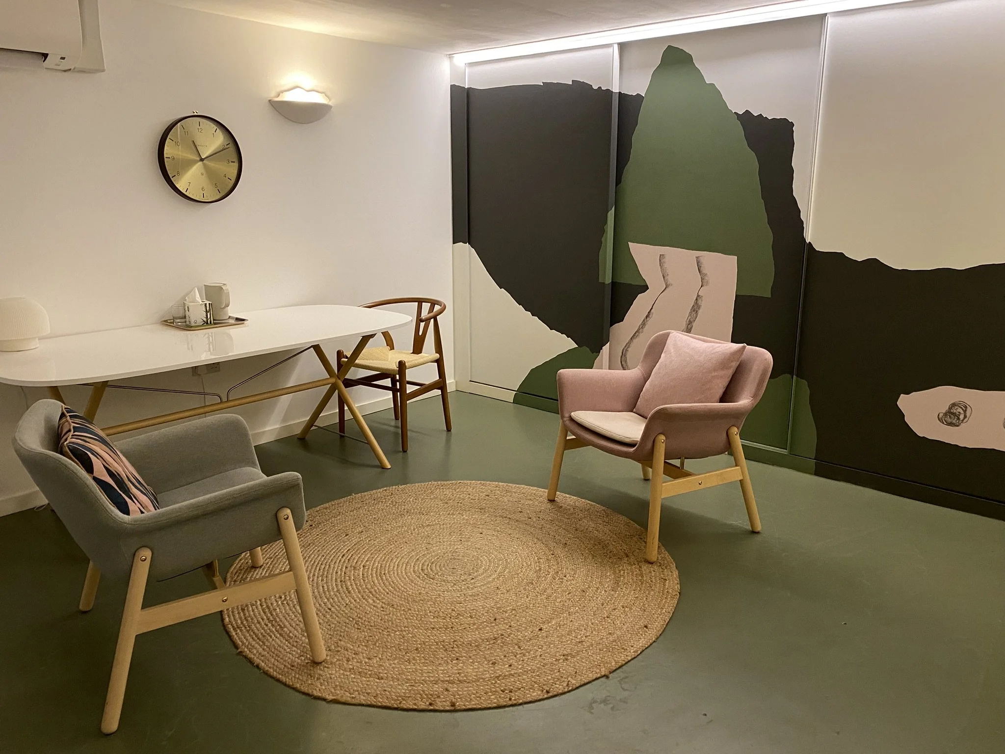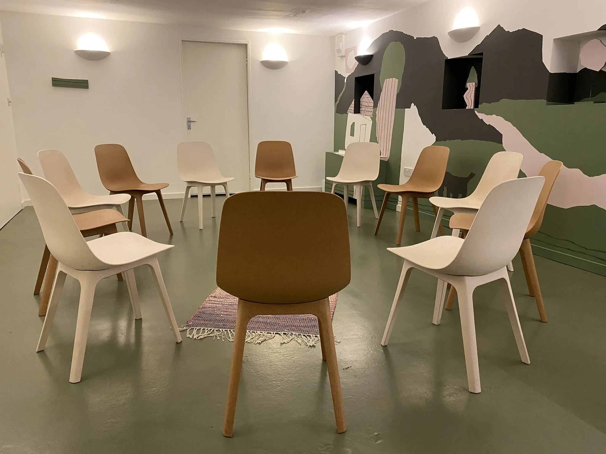 Large Group Therapy RoomGround floor, double door entry, seats up to 20 in a circle or more in rows. Kitchenette with kettle, sink and herbal teas provided. Large cupboard for storage along with kitchenette storage